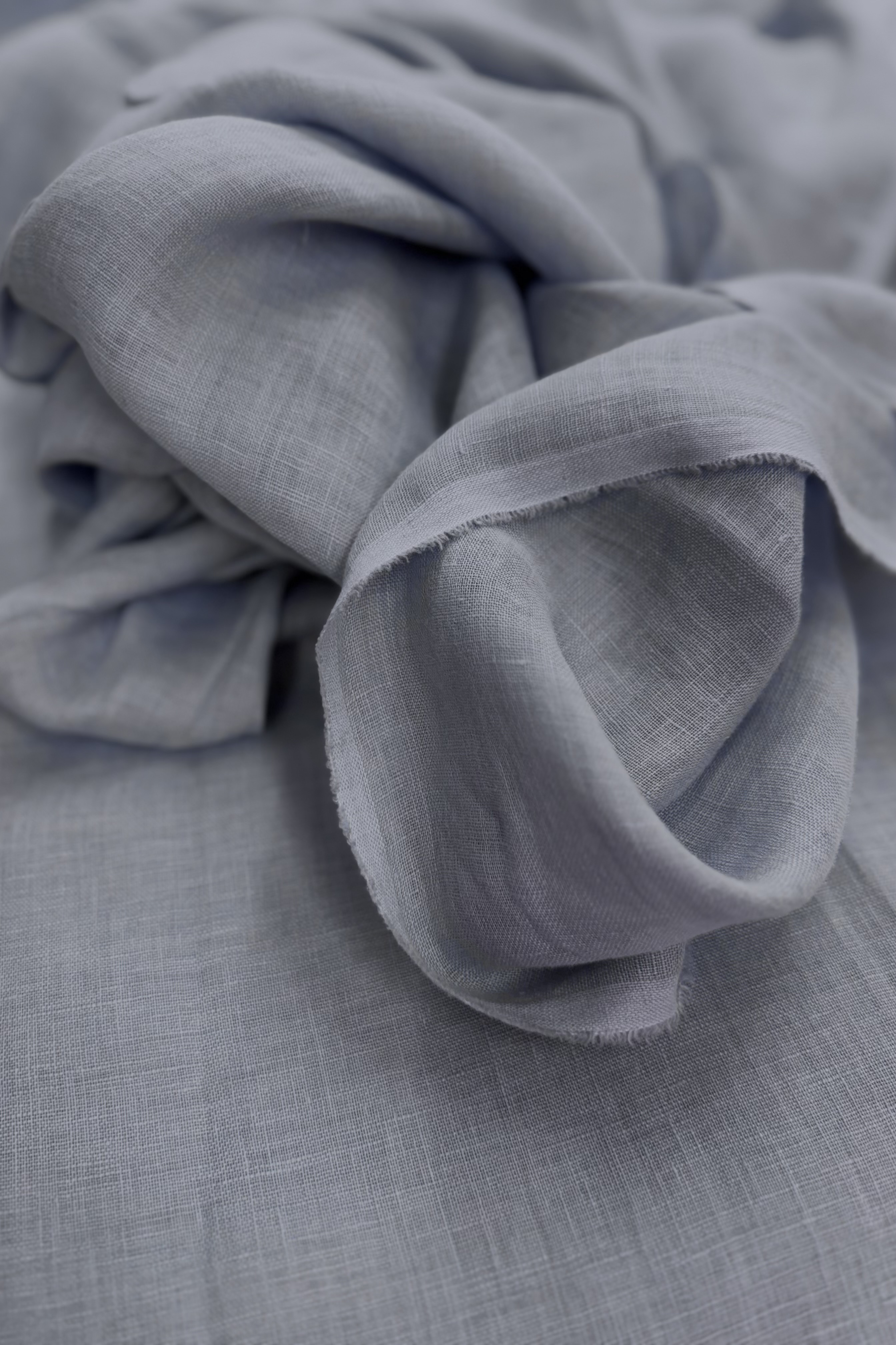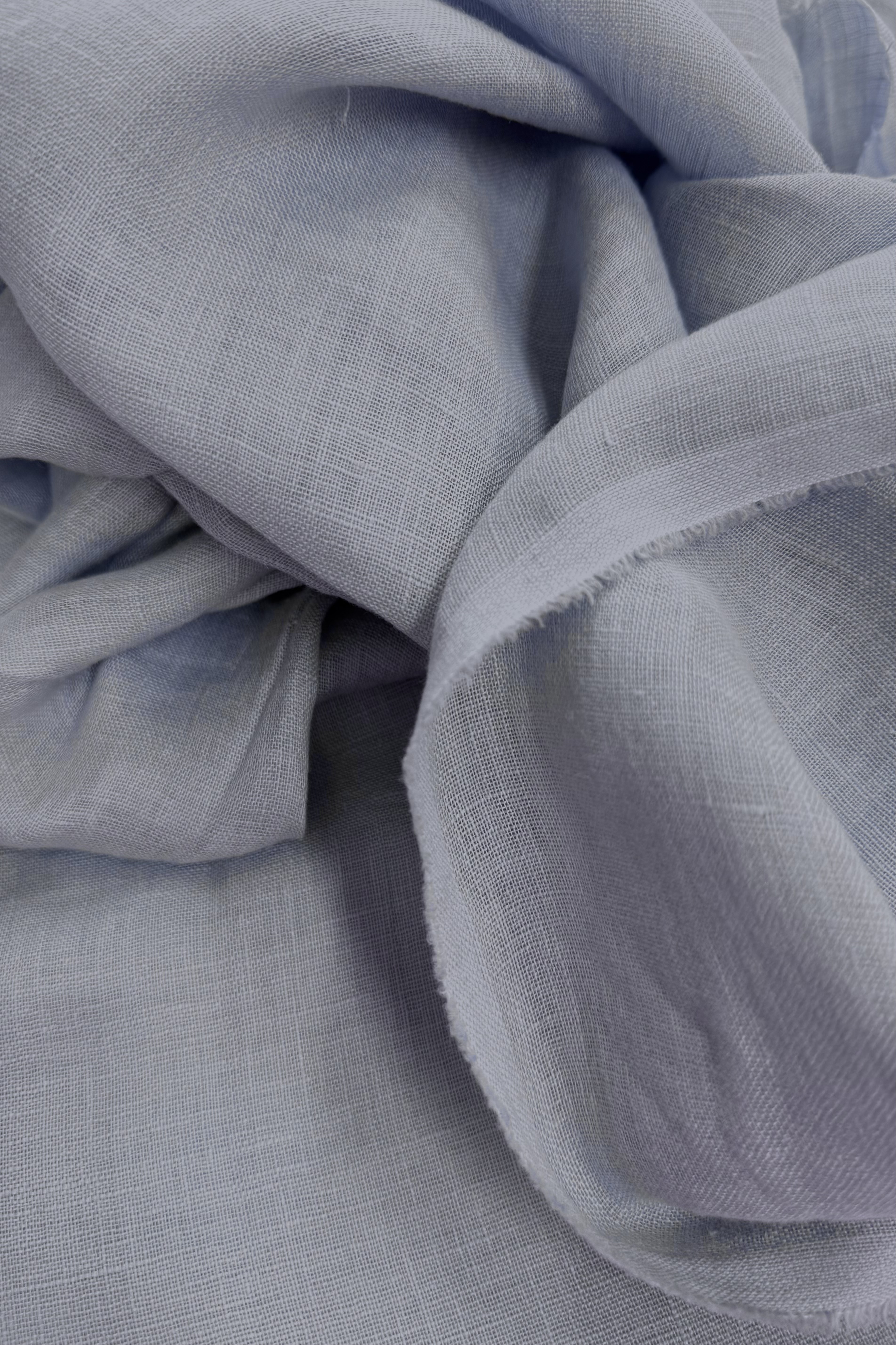 Soft and smoky blue. A lightweight, soft and bouncy linen with a gauzy texture. This delicate linen is sem-sheet so you will need to line it or double up the cloth. We recommend unbleached washed muslin as a lining.