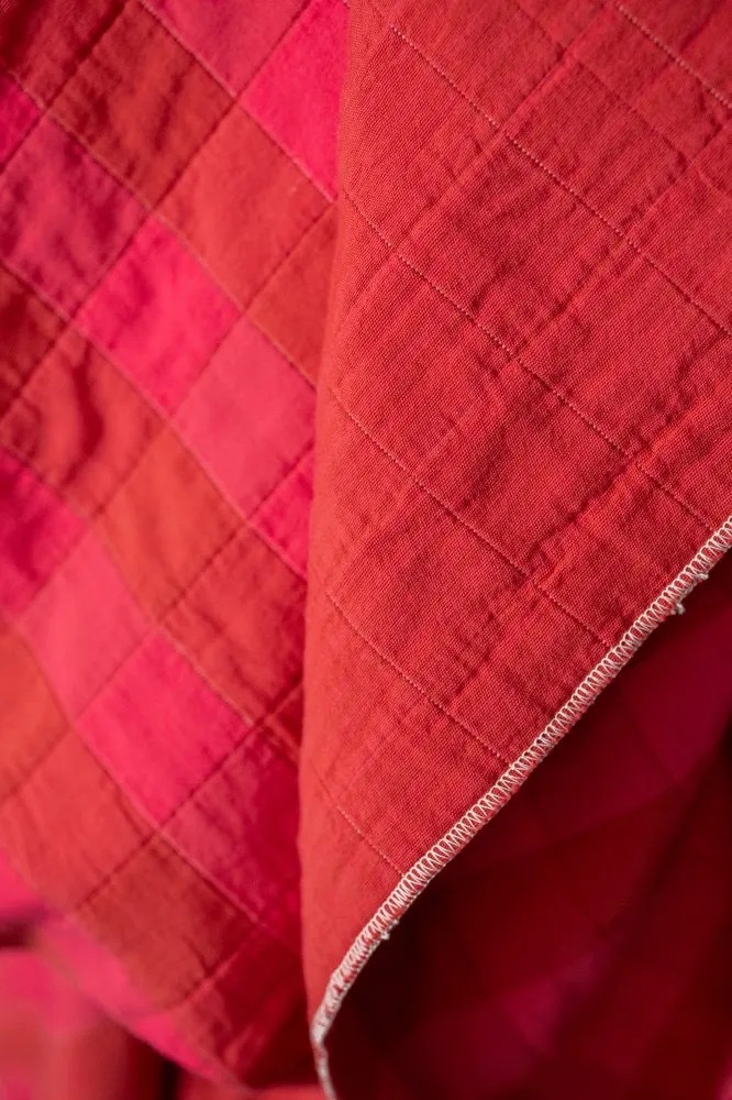 Polly gingham is a fuchsia pink and red gingham with a very subtly stripe reverse.
