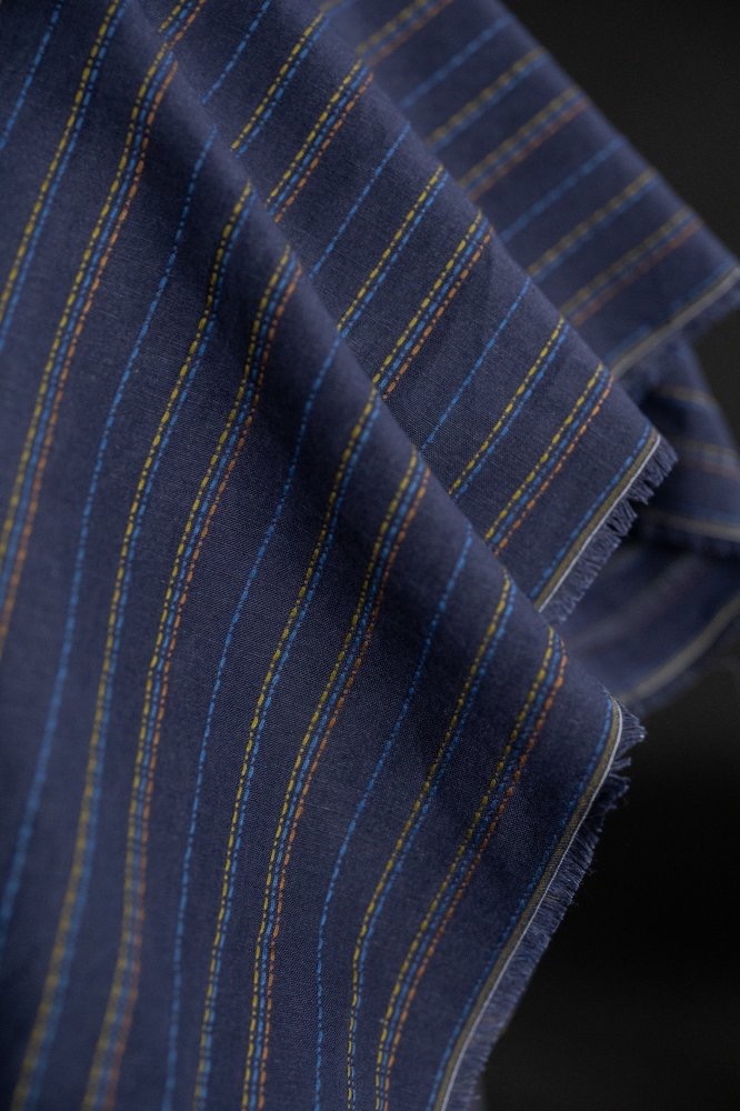 A dark blue cotton/linen blend fabric with a green, blue and tan stitch detail running parallel to the selvedge.