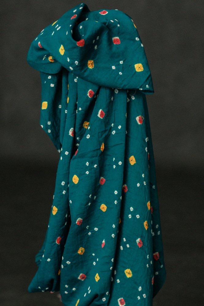 Bandhani is a traditional tie-dye technique where the cloth is pinched with fingernails and bound in thread. This gives the fabric lots of dots of different colours.